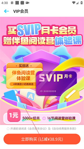 3、点击会员购买选项后,进入SVIP月卡购买页,需先勾选服务协议,才能点击【立即购买】。