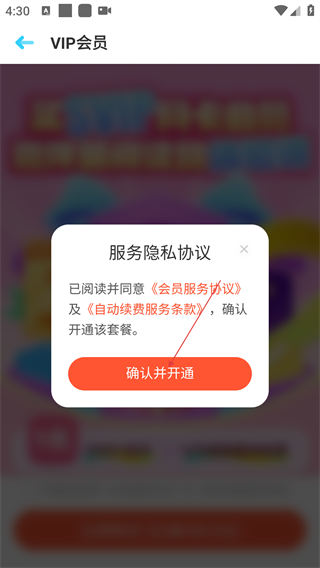 4、勾选协议后会弹出服务隐私协议弹窗,点击【确认并开通】即可完成会员套餐的开通操作。