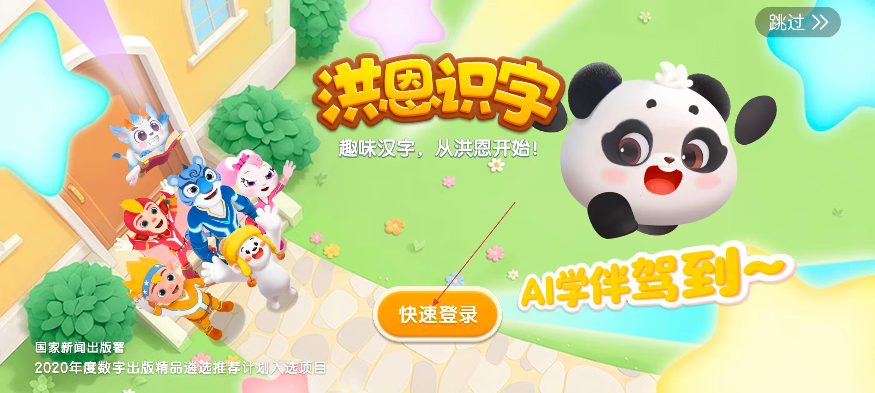 1、进入洪恩识字APP后,点击【快速登录】可进入登录界面,界面有可爱的卡通形象,营造友好的使用氛围。