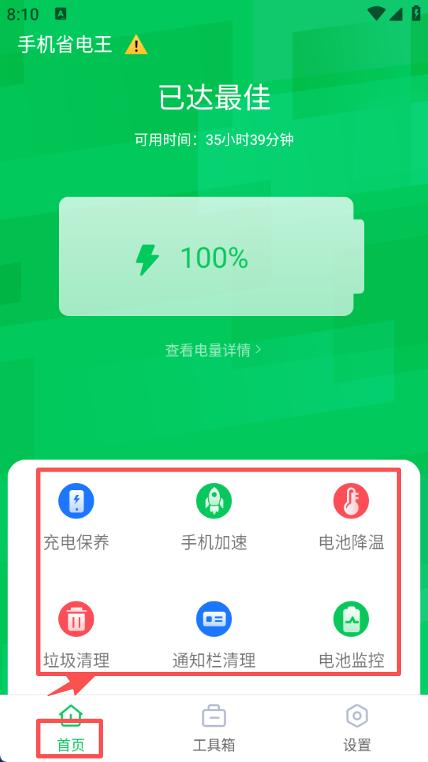1、点击底部 “首页”,页面会显示电池电量、可用时长,还能找到充电保养、手机加速等功能按钮,可直接操作优化设备。