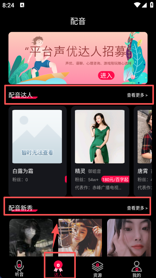 2、点击底部 “达人” 按钮,页面会展示配音达人与新秀的相关信息,还能查看他们的作品及服务报价。