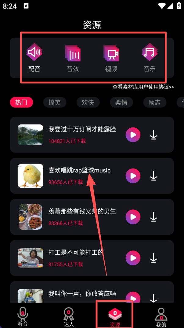 3、切换到 “资源” 页面,这里涵盖配音、音效、视频、音乐等素材分类,热门资源也会在此集中呈现。