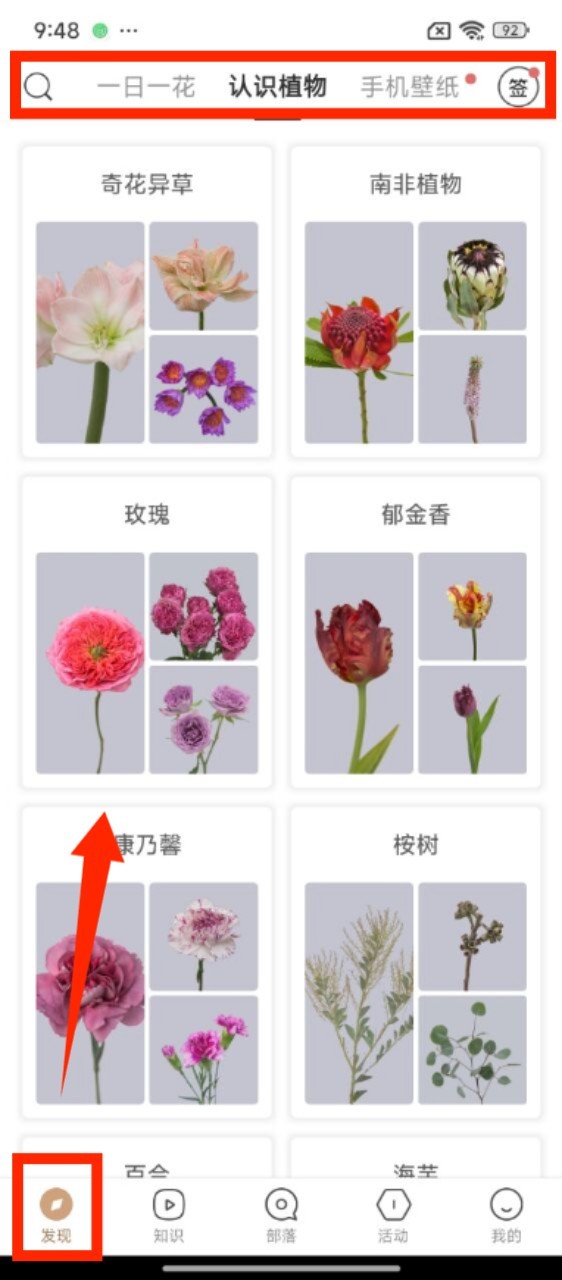 1、进入 “发现” 页面,顶部有一日一花、认识植物等功能入口,下方按品类划分奇花异草、玫瑰等植物板块,可直接浏览。