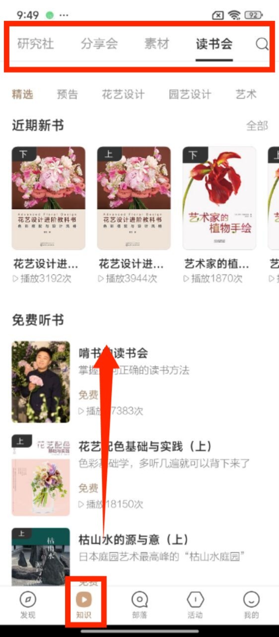 2、点击底部 “知识” 按钮,页面会展示研究社、读书会等板块,近期新书与免费听书内容也能在此找到并查看。