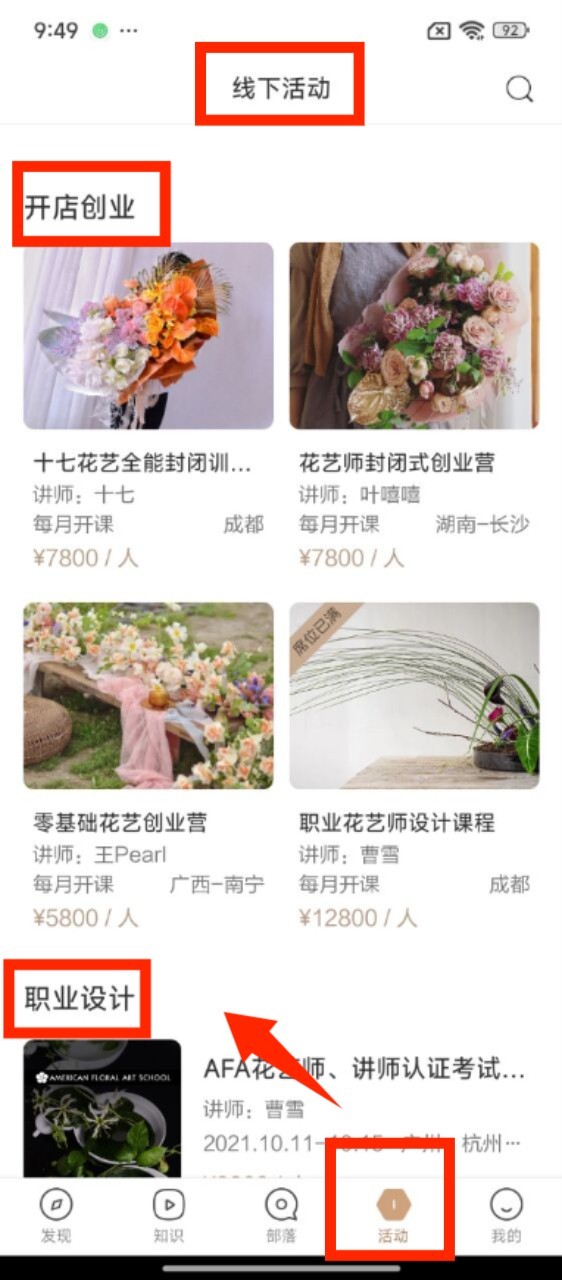 3、切换到 “活动” 页面,能看到线下活动分类,涵盖开店创业、职业设计等花艺相关课程,可查看课程地点与费用。