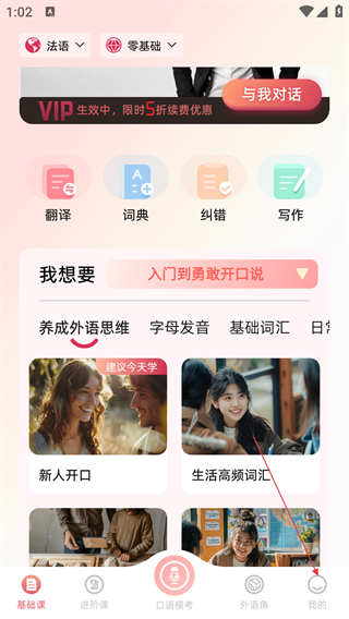 1、进入该法语学习应用后,可在首页学习基础课程,也能点击底部【我的】进入个人界面。