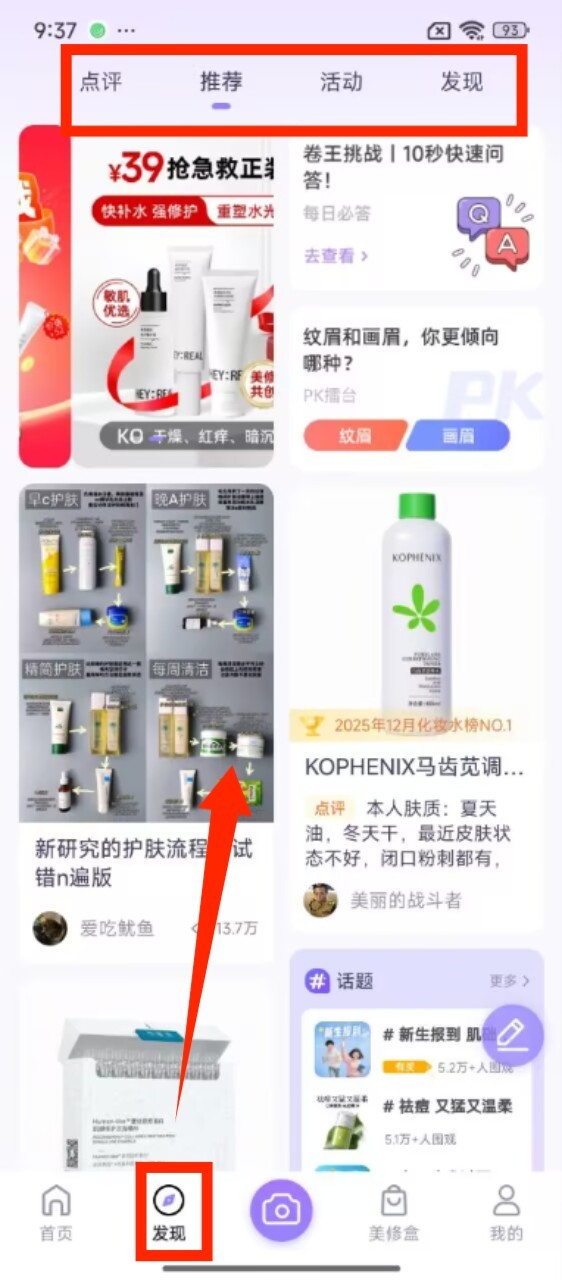 2、点击底部 “发现”,页面会展示点评、推荐等板块,还能查看护肤流程分享与产品测评内容。