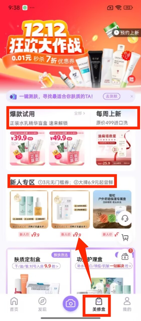 3、切换到 “美修盒” 页面,可看到爆款试用、每周上新等板块,新人专区还有低价美妆好物可选购。