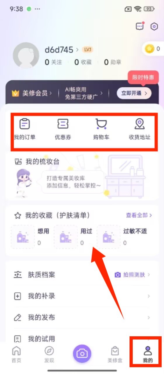 1、进入首页,顶部能看到 AI 测肤、美修榜单等功能入口,下方还有美妆试用与优惠活动可供浏览。