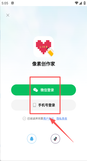 1、打开像素创作家勾选已阅读用户隐私条款后点击微信登录。