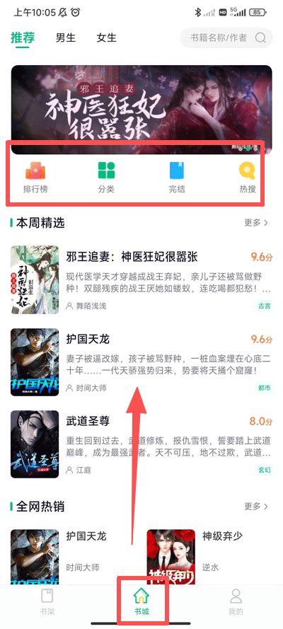 2、切换至 “书城” 页面,能看到排行榜、分类等功能入口,还可浏览本周精选、全网热销等板块的推荐小说。