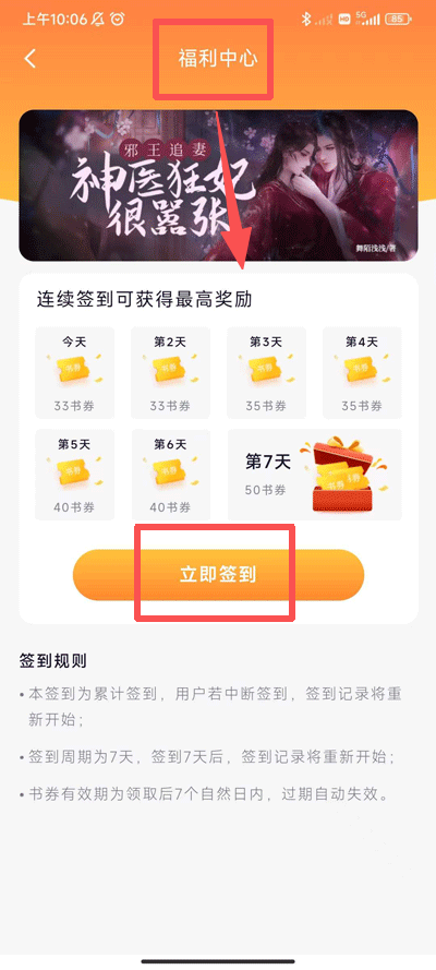 3、找到 “福利中心” 入口进入,在该页面可参与连续签到活动,点击 “立即签到” 就能领取对应的书券奖励。