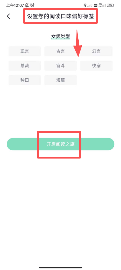 4、进入阅读口味偏好设置界面,选择女频类型下的标签后,点击 “开启阅读之旅” 即可完成偏好配置。