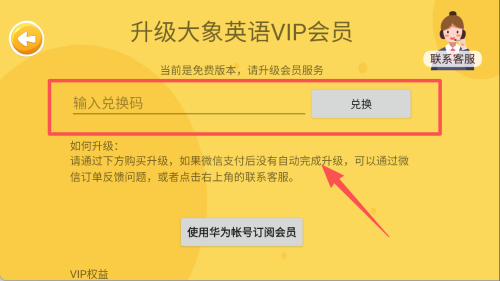 4、点升级VIP输兑换码,微信支付后联系客服同步权益。
