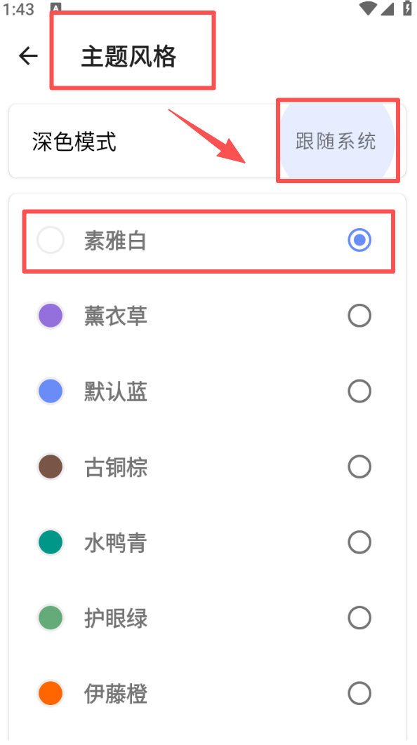 2、切换到主题风格页面,选择 “素雅白” 等配色,搭配 “跟随系统” 的模式,调整界面显示样式。