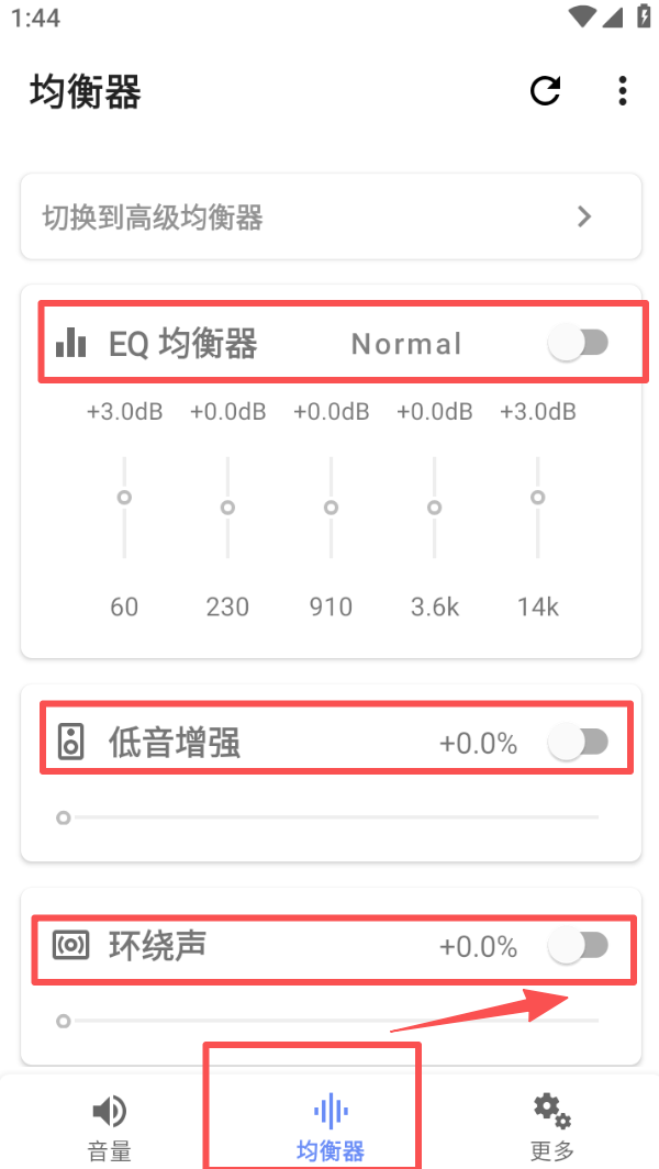 3、打开均衡器页面,开启 EQ 均衡器、低音增强等功能,调节音频参数优化播放音效。