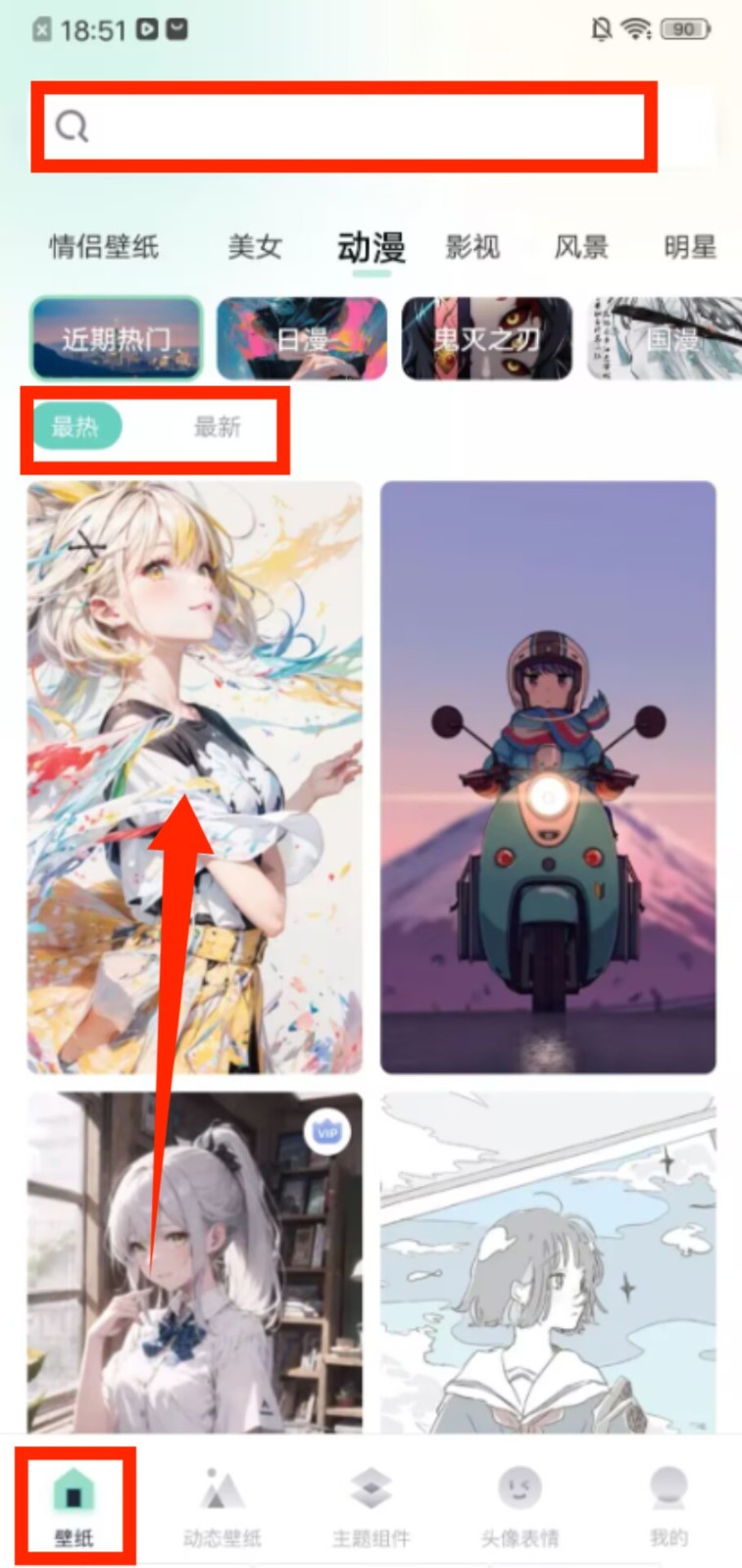 1、进入壁纸页面,在 “动漫” 分类下通过搜索栏查找内容,也能切换 “最热”“最新” 标签浏览不同排序的壁纸。