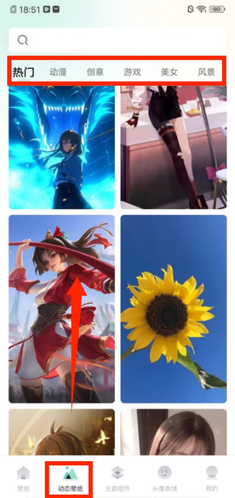 2、切换到动态壁纸页面,在 “热门”“游戏” 等分类中,可挑选动态效果的壁纸,更换设备背景样式。