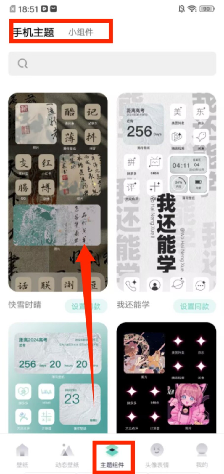 3、打开主题组件页面,在 “手机主题” 板块选择心仪的主题套装,应用后调整设备界面的整体风格。