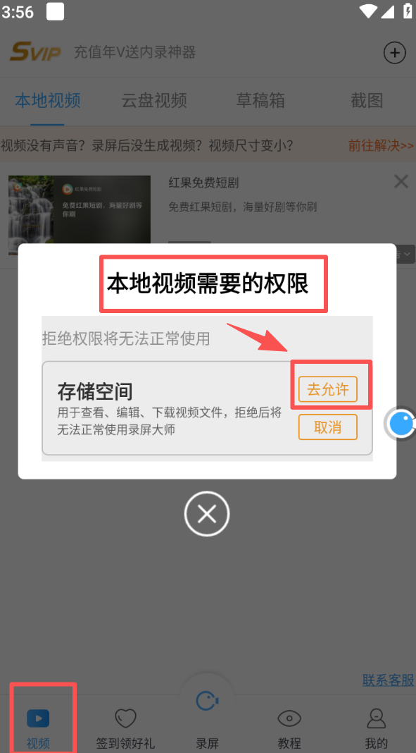 3、切换到视频页面,在本地视频权限弹窗里,点击 “去允许” 开启存储空间权限,以便管理视频。