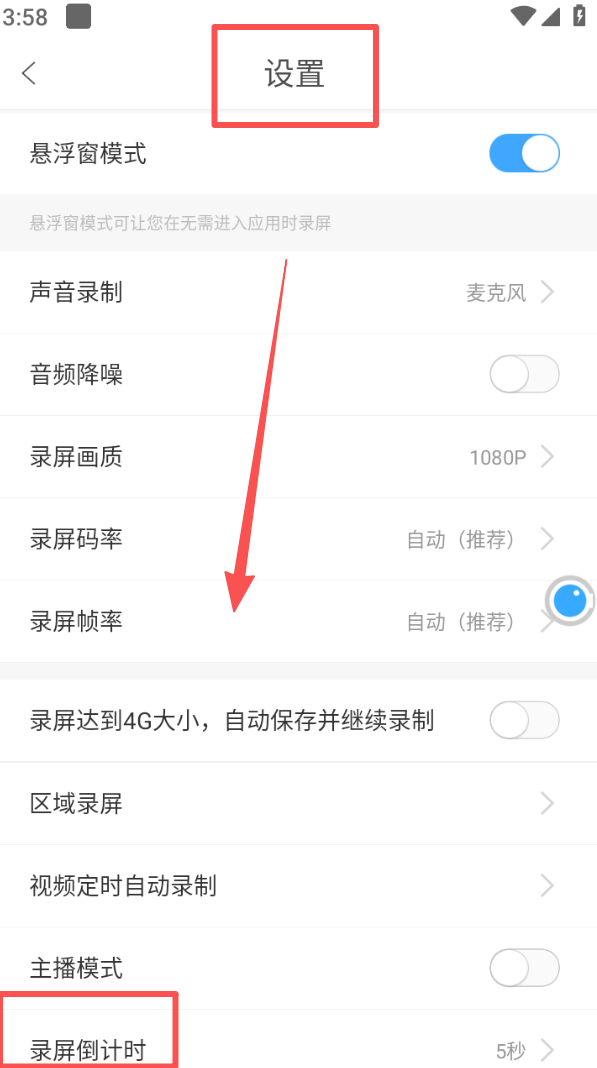 4、进入设置页面,调整悬浮窗、录屏画质等选项,也可修改录屏倒计时时长,适配录屏需求。