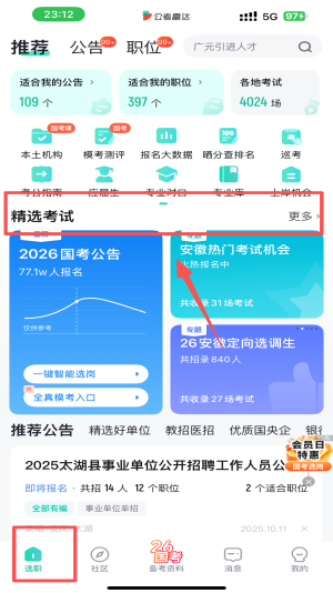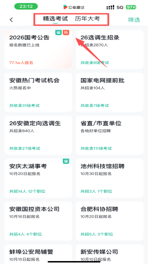 2、筛选考试:点击“精选考试”筛选适合的考试机会,查看详细信息。