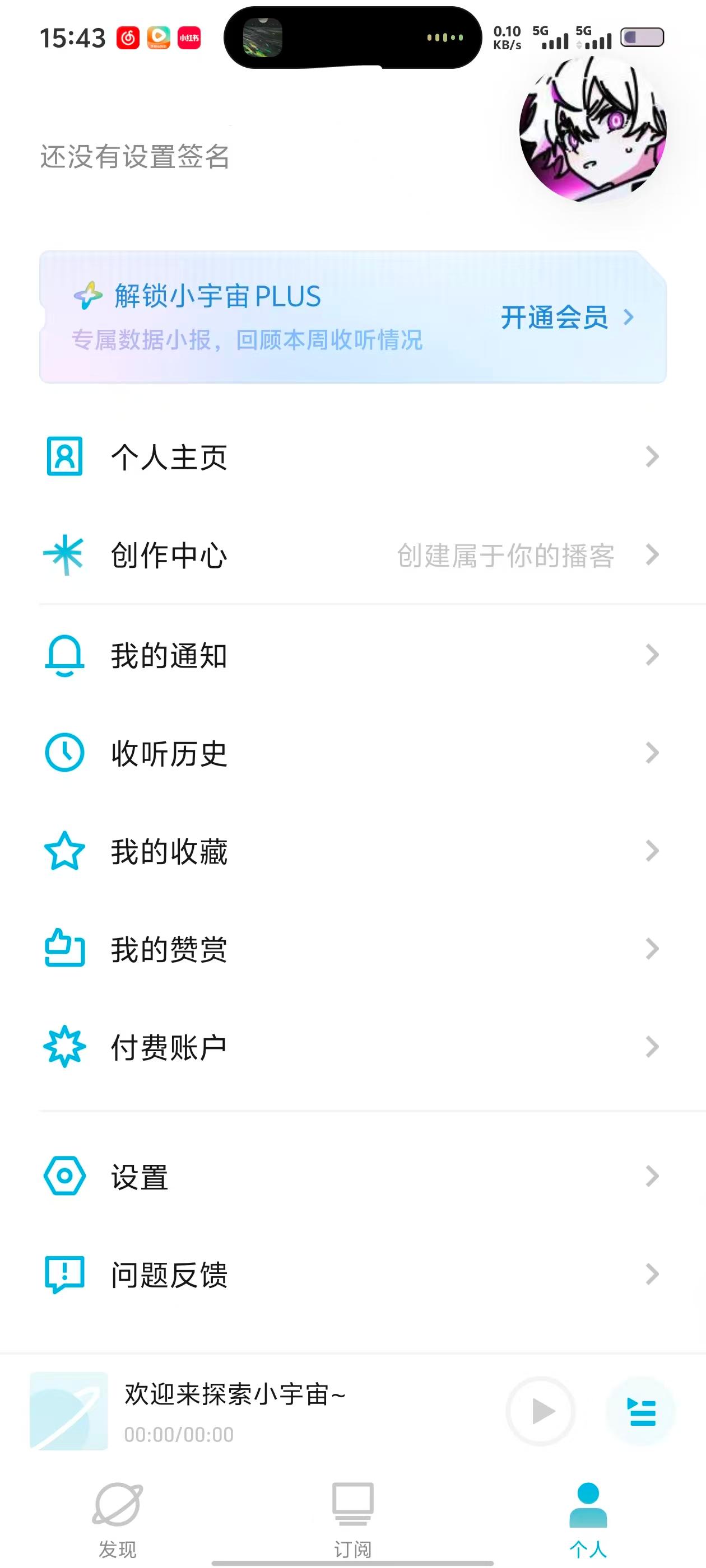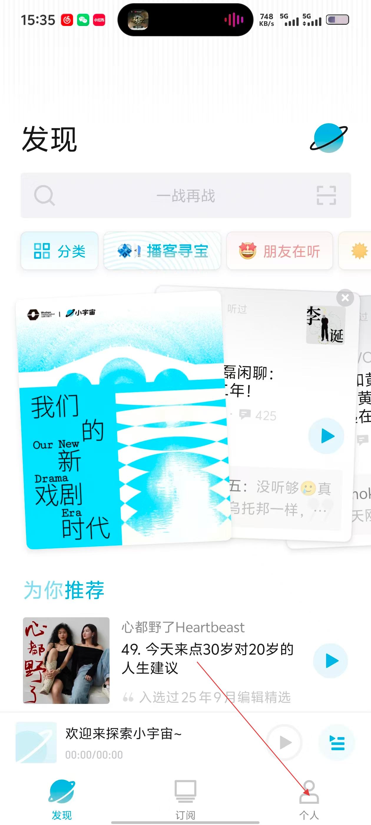 1、在小宇宙APP发现页面,点击底部【个人】选项,进入个人中心页面。