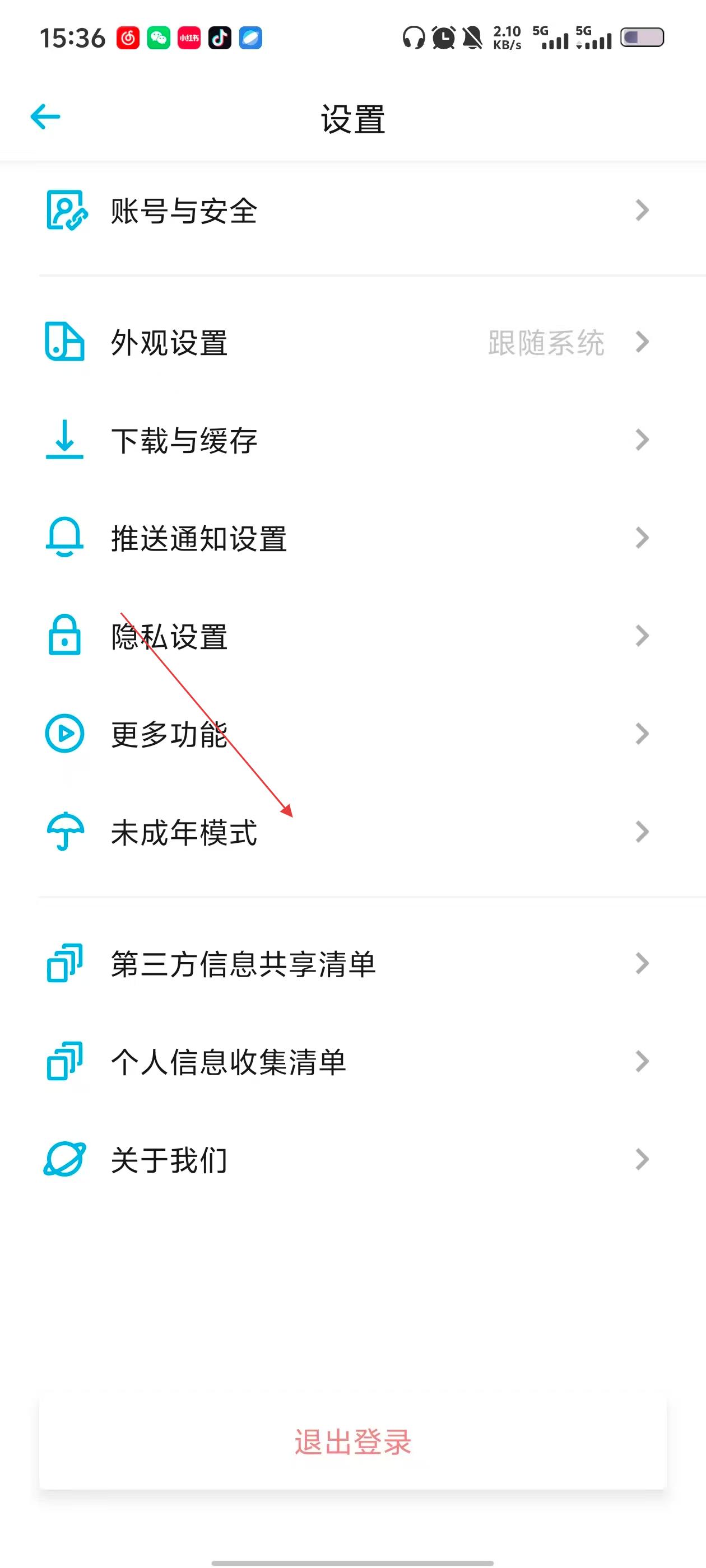 3、在设置页面,点击【未成年模式】选项,进入未成年模式页面。