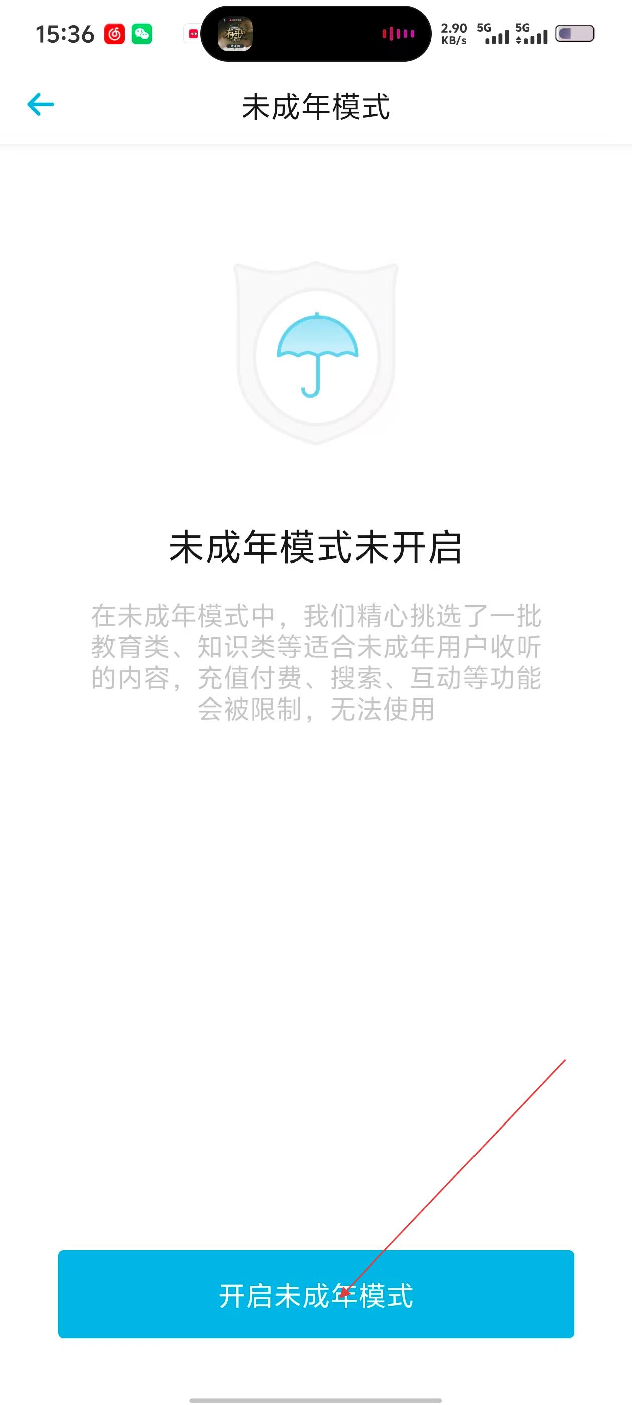 4、在未成年模式页面,点击【开启未成年模式】按钮,按照提示完成设置,即可开启未成年模式。