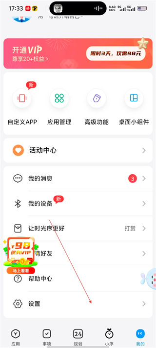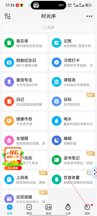 1、在时光序应用页面,可使用备忘录、记账、倒数纪念日等功能,点击底部【我的】可进入个人中心。