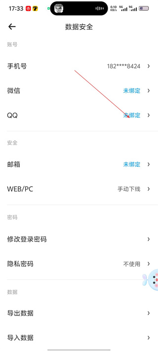 4、在数据安全页面,可绑定QQ账号,还可进行数据导出、导入操作,保障账号数据安全。