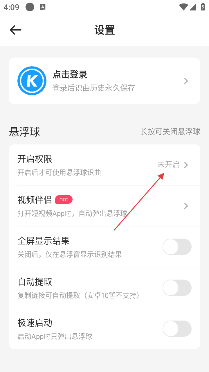 3、在设置页面,若要开启悬浮球权限,点击【开启权限-未开启】选项。