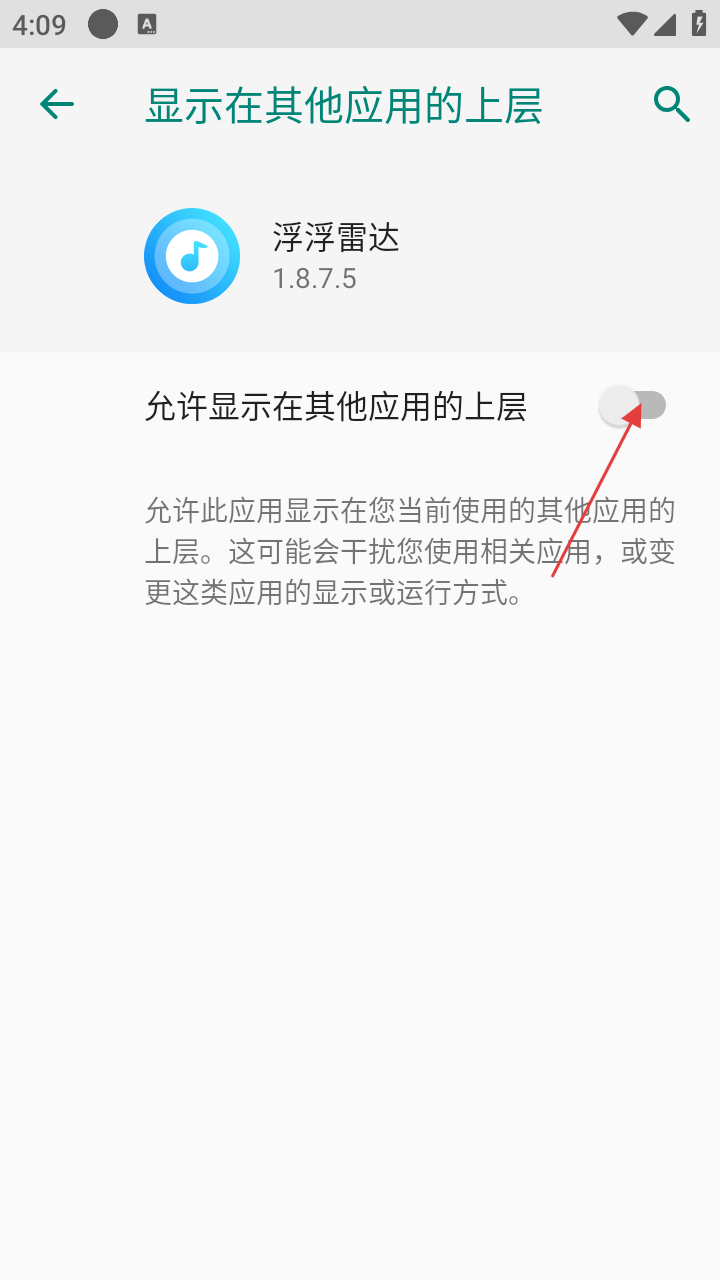 4、进入权限设置页面后,点击【允许显示在其他应用的上层】右侧的开关,开启该权限。