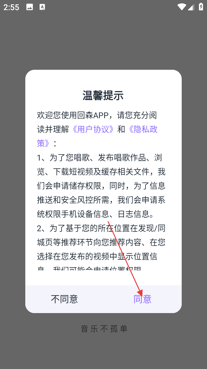 1、打开回森APP,会弹出【温馨提示】弹窗,阅读后点击【同意】,即可进入登录页面。