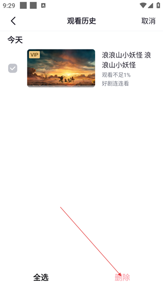 4、在观看历史编辑模式下,可选择要删除的视频,点击【删除】即可移除该观看记录。