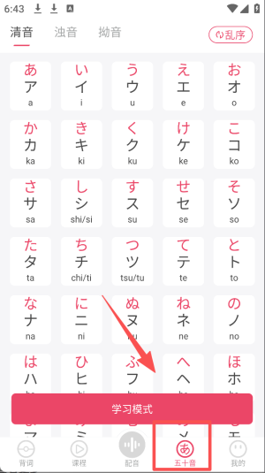 4、在五十音页面,点击“学习模式”。通过学习模式掌握日语发音,提高配音的准确性。