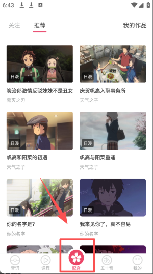 1、在推荐页面,点击底部的“配音”按钮。进入配音功能,选择你感兴趣的动漫进行配音练习。