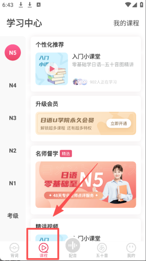 3、在学习中心,点击“课程”按钮。选择适合你的日语课程,系统学习日语知识。