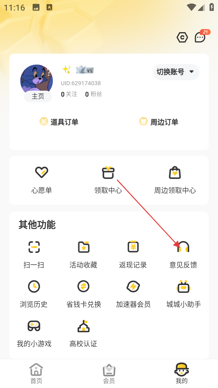 2、在【我的】页面,点击【意见反馈】可进入反馈界面,还能查看心愿单、领取中心、周边领取中心等功能。