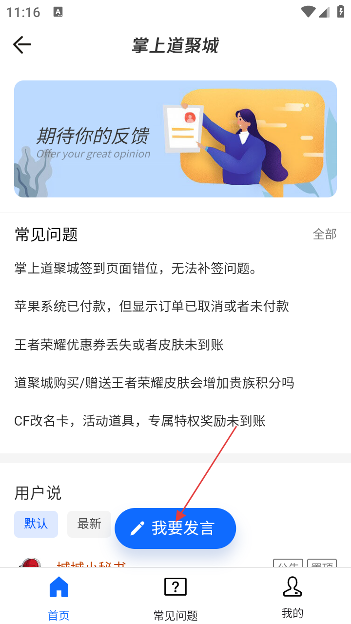 3、在意见反馈界面,点击【我要发言】可进入反馈编辑页面,可查看常见问题及用户发言。