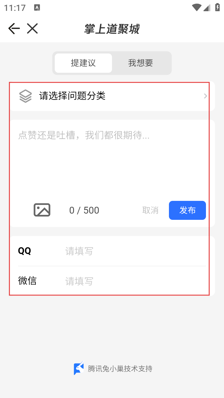 4、在反馈编辑页面,选择问题分类、输入反馈内容,填写QQ或微信信息后点击【发布】,即可提交反馈。