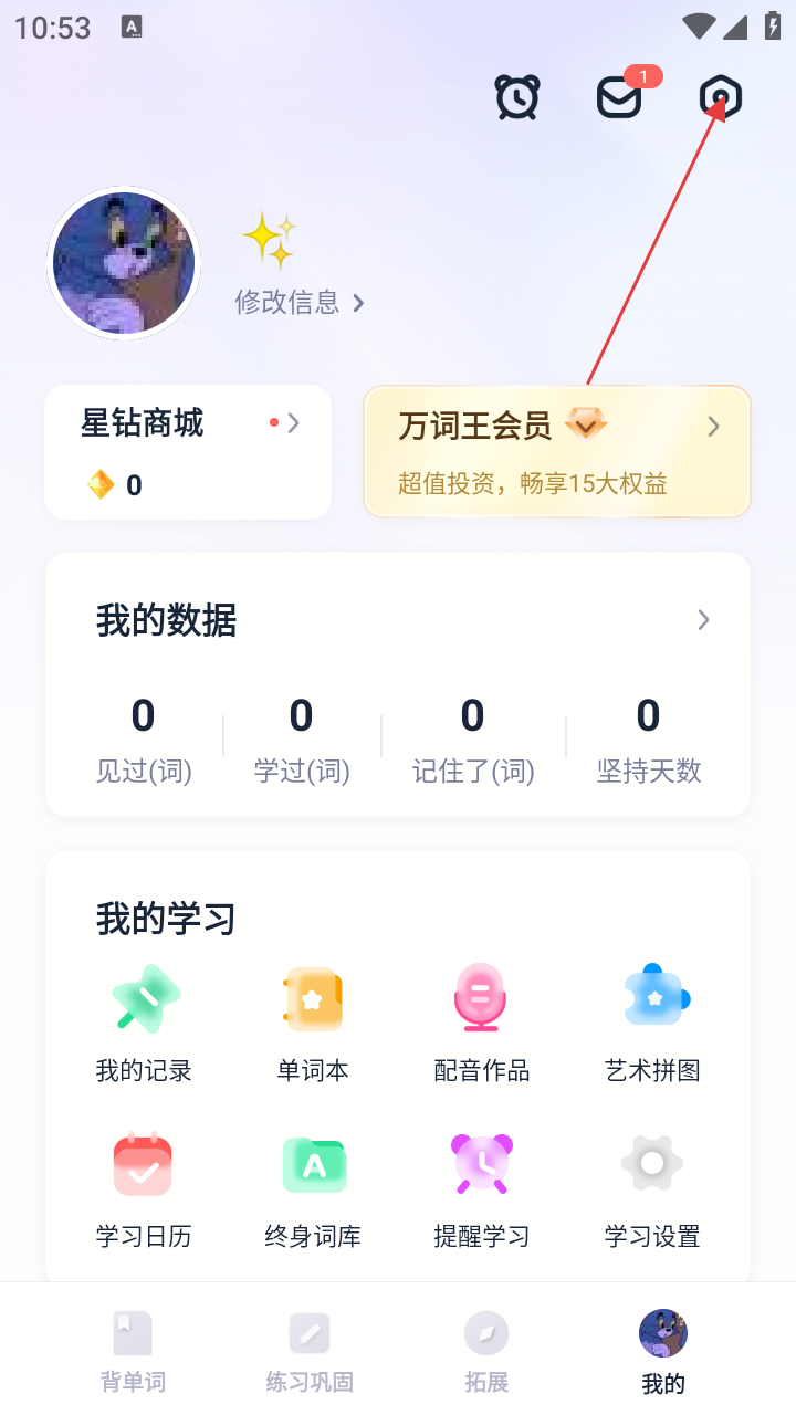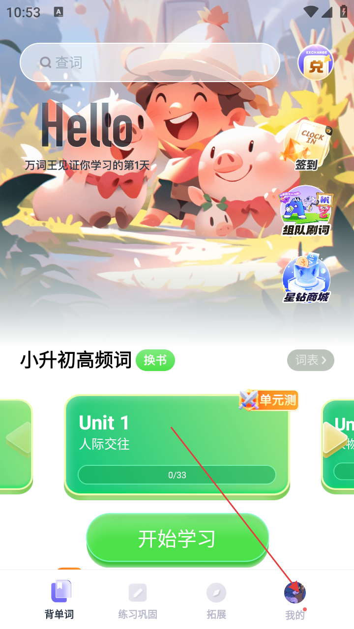 1、在【万词王】背单词页面,若要进入个人相关页面,点击右下角【我的】选项。