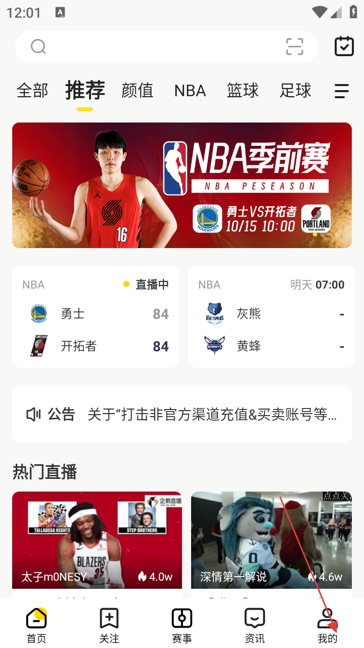 2.主界面上展示了最新的NBA和中超足球比赛的直播信息,用户可以轻松找到自己感兴趣的比赛。