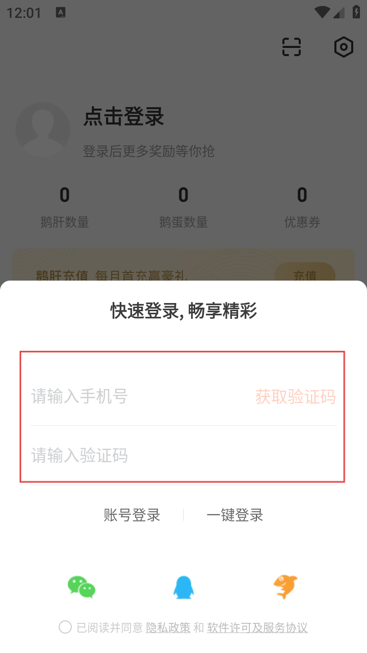 4、在登录界面,可选择输入手机号获取验证码登录,也可选择其他登录方式。