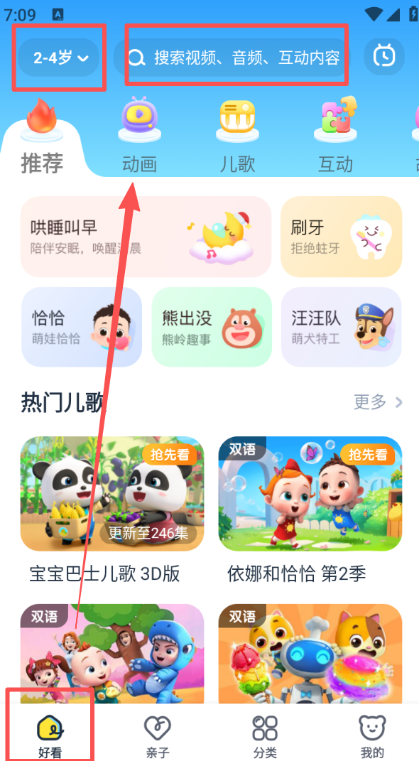 1、进入好看板块,可选择适合 2-4 岁的内容,还能通过搜索框查找视频、音频等资源。