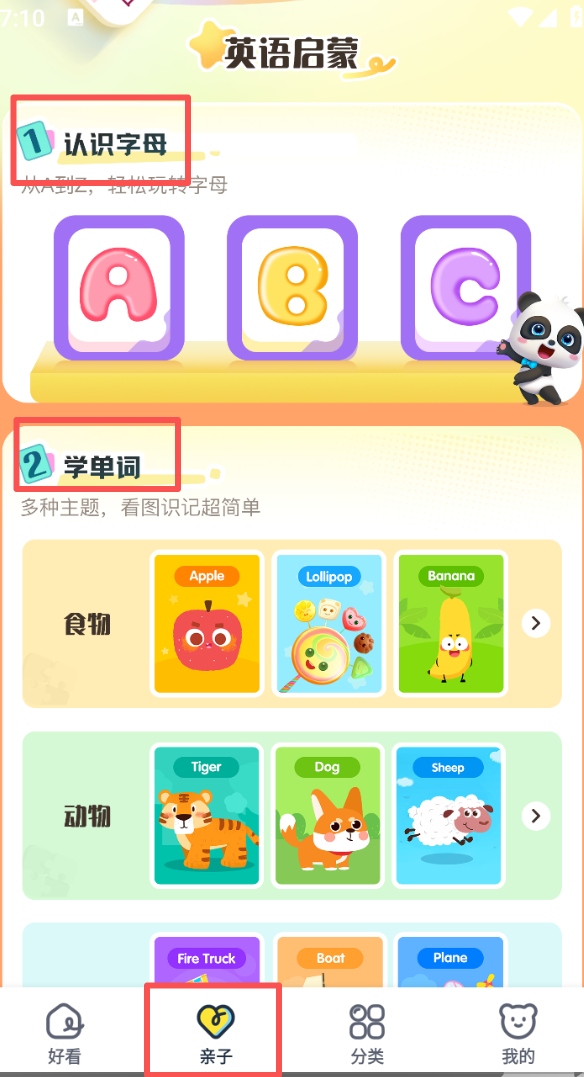 2、切换到亲子页面,有认识字母、学单词等英语启蒙内容,助力孩子学习。