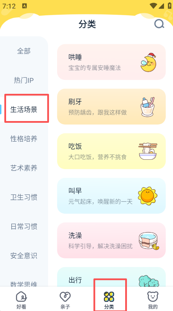 3、进入分类板块,选择生活场景分类,可找到哄睡、刷牙等贴近生活的内容。