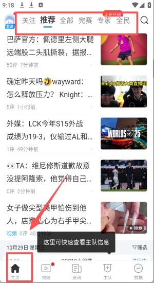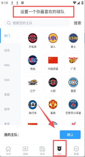 4、在主队页面搜索并设置你最喜欢的球队为关注主队。
