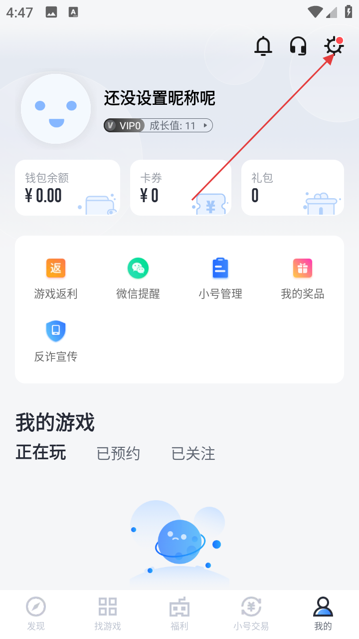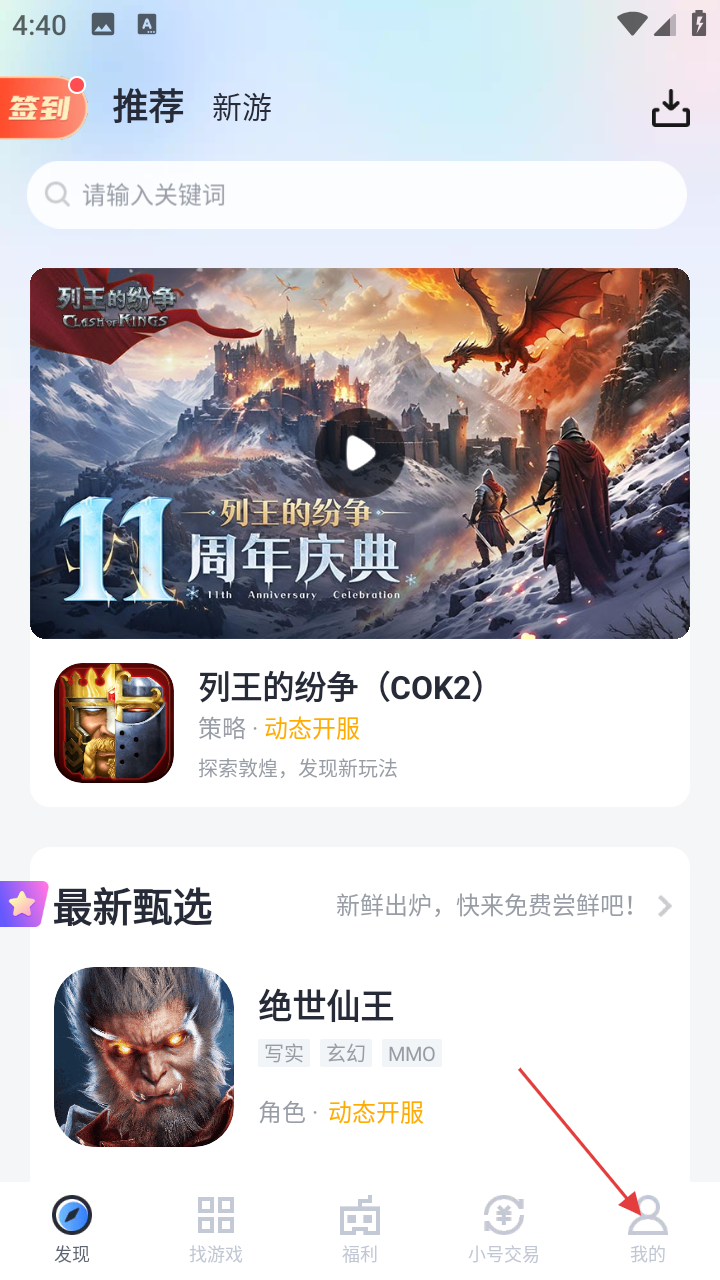 1、在果盘游戏主界面,若要进入个人相关页面,点击右下角的【我的】图标。
