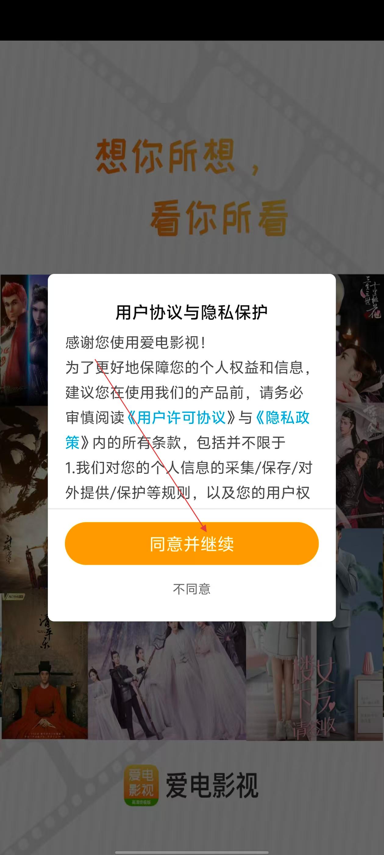 1、打开爱电影视APP后,会弹出“用户协议与隐私保护”提示框,点击【同意并继续】,进入APP主界面。